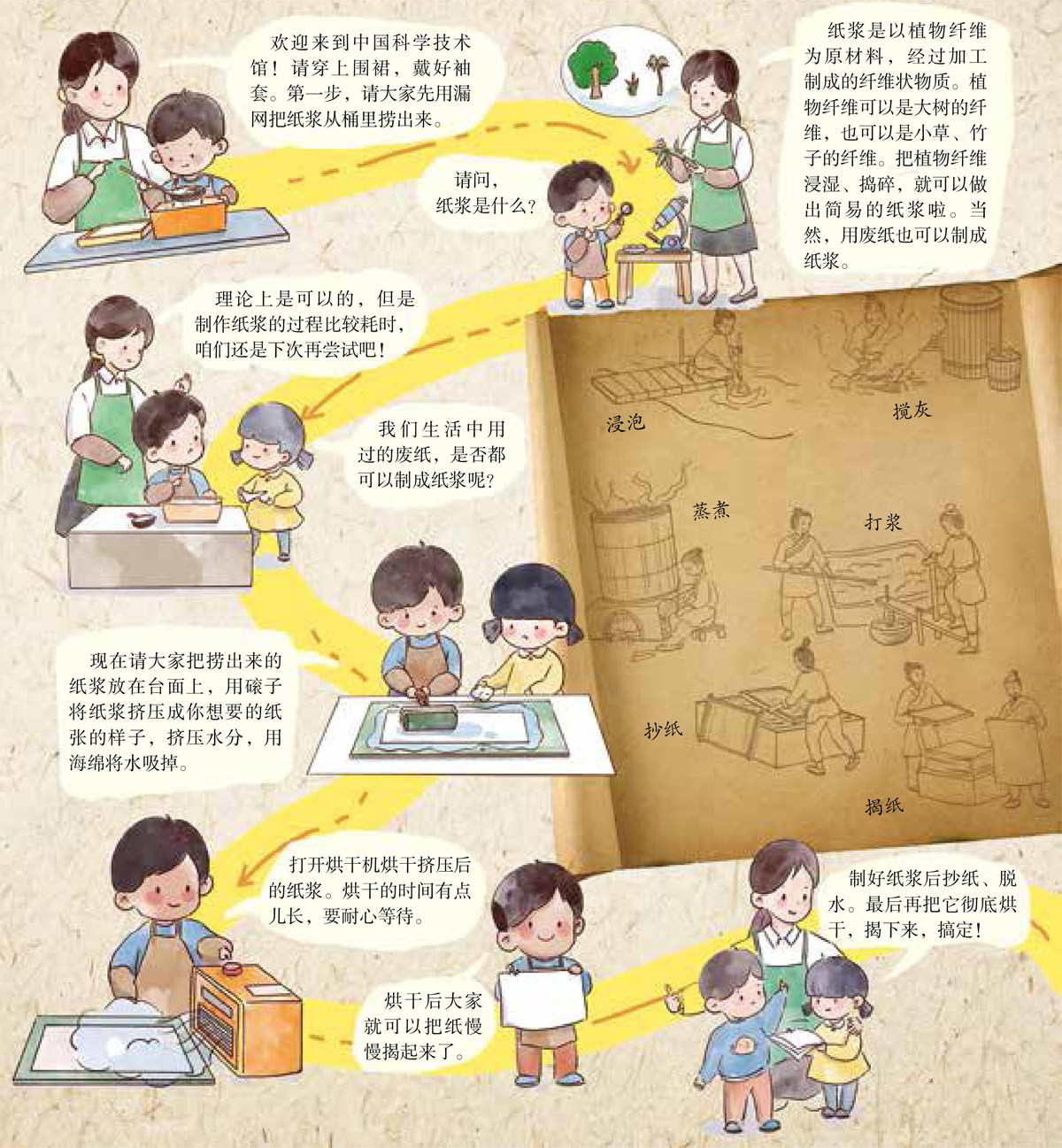 欢迎来到中国科学技术馆!请穿上围裙,戴好袖套。第一步,请大家先用漏网把纸浆从桶里捞出来。
