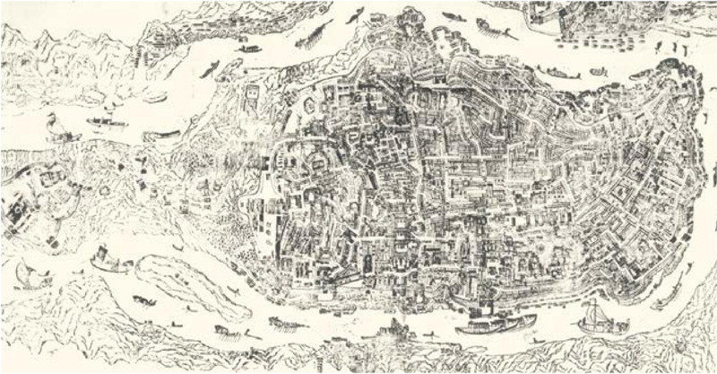 “重庆·城市之路”展厅里有一幅颇有诗意的画卷——《增广重庆地舆全图》,这幅长151.5 厘米、宽85.5 厘米的画卷描绘的是1888年重庆开埠前的面貌。在这幅图上,重庆的母城——渝中半岛还只是一座面积不足5 平方公里,人口不到25 万的小城,古老的街道被17 座城门包裹其中。 回到130 多年前,我们一定要沿着重庆的老城墙走一圈哟,当然啦,这一圈可不短,要走大约10 公里呢!不过,自那时一直