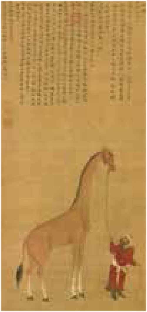 明成祖永乐十二年(1414)秋天,一个叫作榜葛剌的国家送给我国一只“麒麟”。当时很多官员都上表请贺,祝贺皇帝获得了这样一只神兽。尽管皇帝很谦虚地让大家不要表贺,但依然把这件事当成一个祥瑞之兆,命翰林院的沈度写了篇《瑞应麒麟颂》,还命令宫廷画师把这只“麒麟”画了下来,于是就有了今天收藏在台北故宫博物院的名画《明人画麒麟沈度颂》。那么,历史上真实的麒麟是什么动物呢? 麒麟是中国古代神话传说中的神