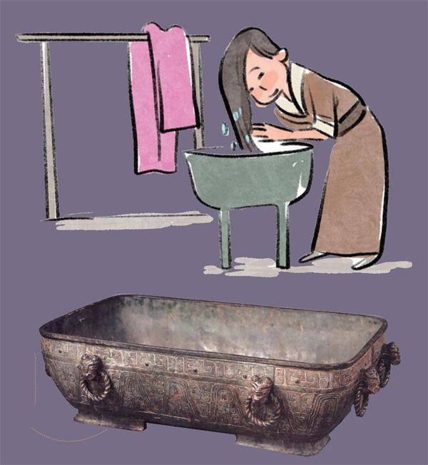 我们现在有时将洗澡说成沐浴,前者比较通俗,后者显得文雅,然而沐浴的原意和洗澡是有区别的。 请大家先看一下“沐”“浴”这两个字的金文写法,“沐”字是一个人用双手掬盆中的水洗头发的样子,而“浴”字则是一个人置身器皿中,并在他的两边加上水滴。这清楚地表明古人将洗头发称为“沐”,将洗身体称为“浴”。 当然,那时候不仅沐、浴的含义不同,人们沐、浴时的用品也有区别。商周时的贵族讲究沐要在汤中加入潘汁。“汤