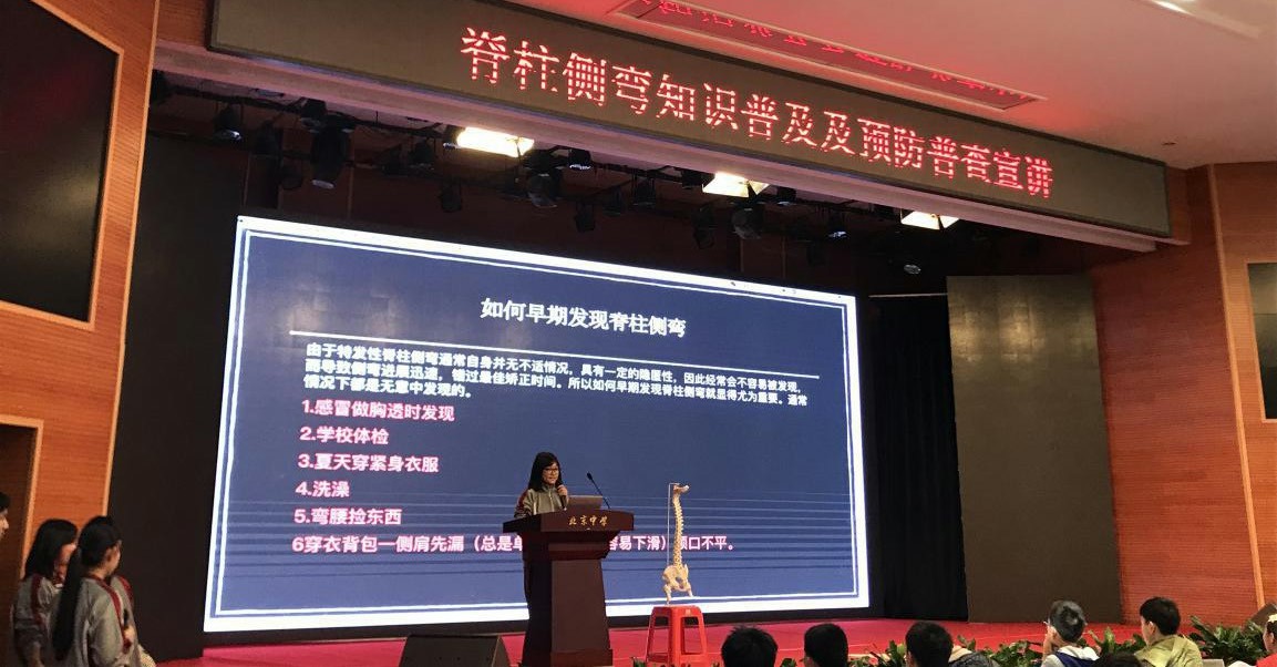 近年来,我国青少年脊柱侧弯的发病率呈上升趋势。据医学文献记载,全球10~15岁青少年发生脊柱侧弯疾病的发病率约为2%~4%。2016年广东省针对全省80万初中生进行普查,发现脊柱侧弯患病率高达5.4%。脊柱侧弯对青少年健康危害极大,在青春的大好时光里,不能让这些健康问题时刻困扰着青少年,我们有必要对脊柱侧弯相关知识进行普及、宣讲。 在北京中学开展的脊柱侧弯知识科普筛查进校园活动项目组内,有3
