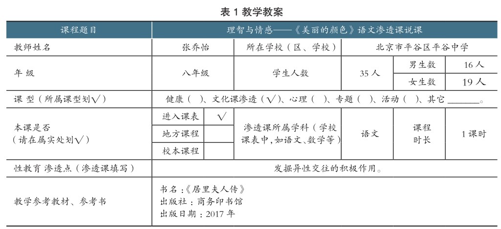 一、教学背景 (一)本课指导思想和理论依据 根据国内外青春期性教育理论和方法研究,初中学段的内容之一包括人际交往中自尊与互相尊重的内涵与方法,以及性、爱与婚姻彼此间的关系,友谊与爱情的涵义。 (二)学情分析 学生对本文的传主居里夫人有一定了解,知道传主的主要科学成就和人格品质,所以学习起来有一种心理上的亲切感。另外,八年级学生已经阅读过较多写人记事的散文,具备阅读写人记事散文的基础知识
