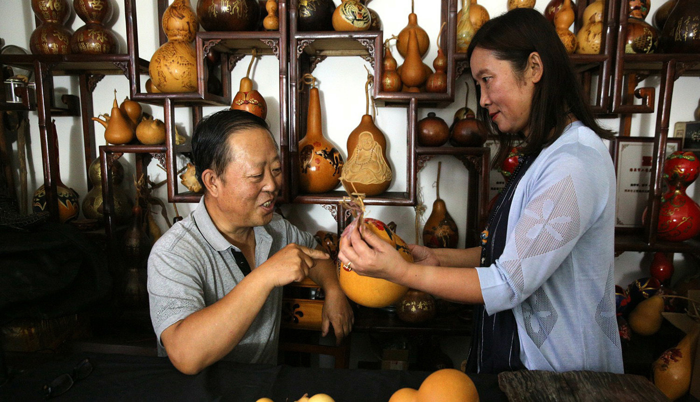 图1 张建维宋红梅夫妇 “绵绵瓜瓞,民之初生”出自《诗经·大雅·绵》,反映的正是源于远古的葫芦崇拜。作为中国传统文化的符号,葫芦有着悠久的历史,籽粒众多,寓意代代传承;圆形外廓,蕴含和谐美满;谐音“福禄”,象征富贵吉祥。“一瓢藏造化,天地一壶中”,葫芦可以说是中华民族最原始的吉祥物。在山西省阳泉市矿区,有一对结缘葫芦的伉俪——张建维、宋红梅夫妇,他们以葫芦为纸,妙手着锦,匠心雕琢,让