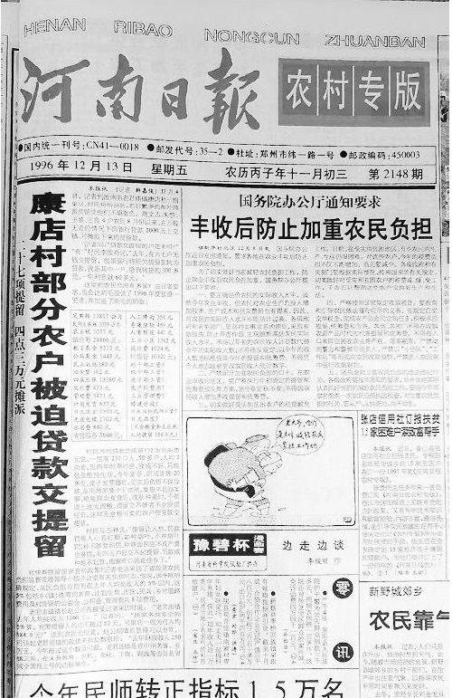 前些日子,整理旧物,一本24年前的《新闻爱好者》杂志上的一篇文章,唤起了我对一则舆论监督报道的回忆。这篇文章是时任郑州大学新闻系主任项德生教授在1997年第5期《新闻爱好者》“好稿评介”专栏里,发表的《特色鲜明表述科学—读消息〈康店村部分农户被迫贷款交提留〉》。稿件不长,摘录如下: 优秀新闻作品为什么不同凡响。引人入胜呢?首先是或主要是因为作品所反映的新闻事实“出类拔萃”,非同一般。说准确点,就