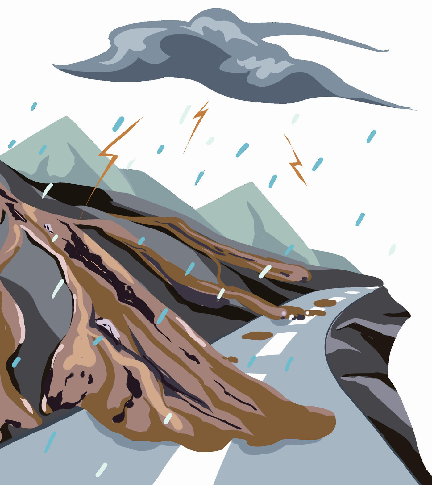 滑坡是指斜坡上的土体或者岩体,受河流冲刷、地下水活动、雨水浸泡、地震及切坡等因素影响,在重力作用下,沿着一定的软弱面或者软弱带,整体地或者分散地顺坡向下滑动的自然现象。俗称“地滑”“走山”“垮山”“山剥皮”“土溜”等。 崩塌是陡坡上的岩土体失去稳定后突然脱离母体向下倾倒、翻滚、坠落的地质现象。 形成条件:一是位于陡坡上(坡度>50°,高度>30m);二是被2—3组高倾角裂隙切割