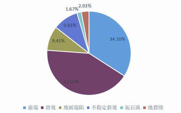 什么叫地质灾害? 地质灾害是指自然因素引发的危害人民生命财产安全的山体崩塌、滑坡、泥石流、地面塌陷、地裂缝、地面沉降等与地质作用有关的灾害。 地质灾害有哪些类型? 滑坡 崩塌 泥石流 地面塌陷 地裂缝 等 贵阳市地质灾害类型占比 截至2020年末,共查出地质灾害隐患点478处,共威胁5.58万人,威胁财产20.3亿元。在已查明的地质灾害隐患中,滑坡201处、崩塌163处、泥石