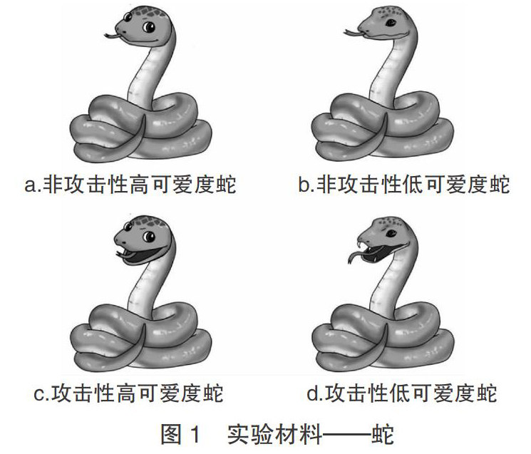 【摘要】本研究通过2(攻击性:攻击性、非攻击性)×2(可爱度:高可爱度、低可爱度)二因素被试内实验设计,采用视觉搜索实验考察幼儿对不同形态蛇的注意偏向。结果表明:攻击性主效应显著,幼儿对非攻击性威胁性刺激的觉察速度显著高于攻击性威胁性刺激;可爱度主效应显著,幼儿对高可爱度威胁性刺激的觉察速度与正确率均显著高于低可爱度威胁性刺激。 【关键词】威胁性刺激;攻击性;可爱度;注意偏向 【中图分类号】G