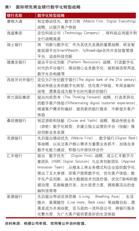 2008年国际金融危机后,在世界经济增速下滑、监管合规要求趋严、金融科技公司分流等多重压力下,各国银行业收入增长均出现明显下降,全球银行业净资产收益率连续十年低于10%。目前,数字化转型已成为拉动经济增长的重要引擎。为顺应数字化发展趋势,国际领先商业银行均已着手探索转型之路,为未来的发展奠定基础。 国际领先商业银行数字化转型经验 近年来,国际领先商业银行纷纷开始数字化转型。根据安永2018年的