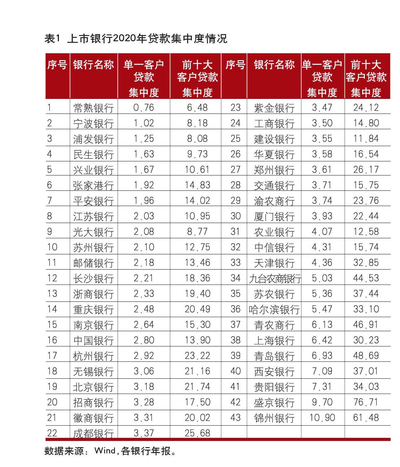 授信集中度管理是银行信用风险管理的重要组成部分,对大额风险敞口的有效管控是银行应对危机的有力保障。纵观亚洲金融危机、美国次贷危机等历次金融危机,授信过度集中加剧了危机事件对商业银行的冲击,造成大量金融机构的破产倒闭。本文研究了上市银行授信集中度的整体情况,对授信集中度管理的目的和意义、维度和方法展开探讨,并试图对银行的授信集中度管理工作提出一些建议。 上市银行授信集中度情况 本文选取了43家上