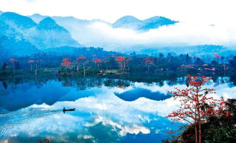 海南省昌江黎族自治县素有“中国木棉之乡”的美称。每年三四月份,是昌化江畔木棉花最艳丽的季节。在木棉花季,木棉花开遍田间地头,漫步木棉花海之中赏花别有一番情趣,仿佛穿梭于一团团火焰之中。昌江,位于海南的西北部,依山面海,距海口市196公里,这里属于典型的热带季风气候区,全年无冬,四季如春,日照充足,生态环境良好。走上海南昌江县宝山木棉观景台,这里山岭起伏,梯田层层,红棉成片,山水相映!登