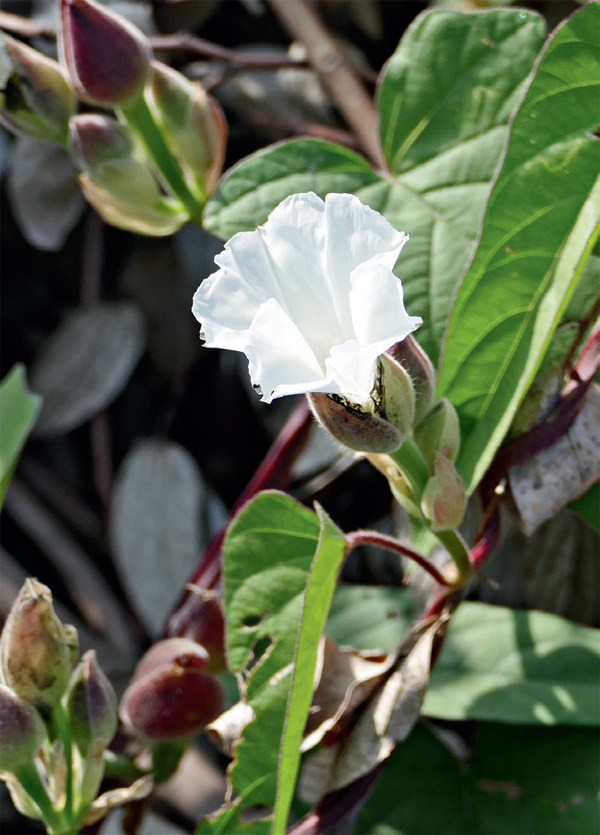 这天,一位朋友在全国的植物群里分享了一种样子很可爱的植物,拍自珠海的野外,名为“ 盒果藤”。我一眼爱上它,直接按朋友给的定位驱车前往,一探究竟。 盒果藤,旋花科盒果藤属多年生缠绕草本植物,也称“松筋藤”“红薯藤”“软筋藤”“假薯藤”“水薯藤”“紫翅藤”,分布于热带亚洲、热带大洋洲、热带东非及马斯克林群岛、塞舌尔群岛等地区,常见于海拔520 米以下的山谷路旁、溪边及灌木丛向阳处。在我国,主