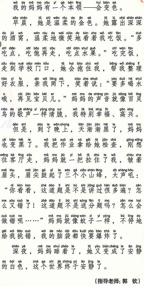 你坐过过山车吗?你知道坐过山车的感觉吗?今天的语文课上,顾老师带我们一起体验了一把坐过山车的刺激。 上课铃刚响,顾老师已经站在讲台上。她一脸严肃地对我们说:“今天来检查一下各位同学的听力怎么样,请拿出作业本。”什么?听力!语文老师要讲英语吗?在作业本上写英语单词,老师这葫芦里卖的什么药?正当全班同学迷惑不解时,老师说:“我来报今天的作业,你们来写。”老师终于说出了答案。 “第一项:抄写课文23