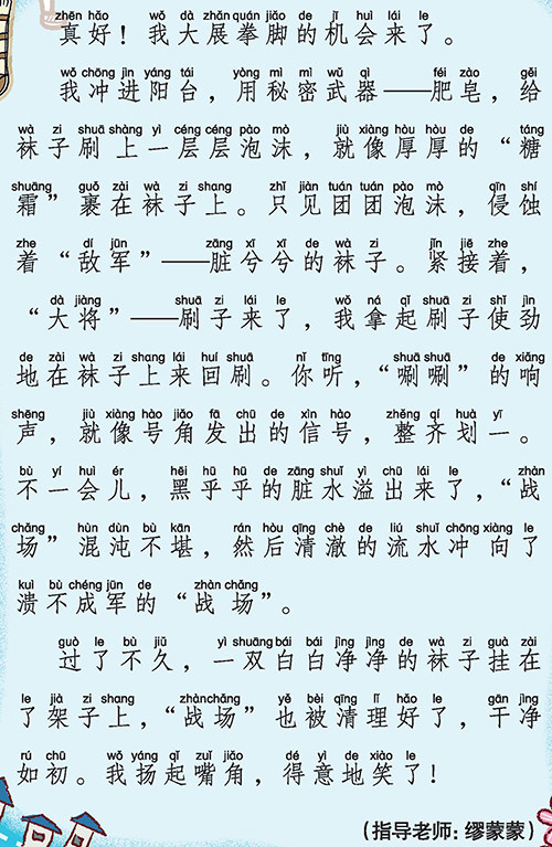 小编插话 架势足,动静大,这是小编读完作文的第一感受,哈哈。小作者用一系列动词给予所用工具角色感,分工明确,各显其用,拟人、比喻等修辞手法又为这“战争”增添了几分气势,不愧“小能手”之称。(青 柚)