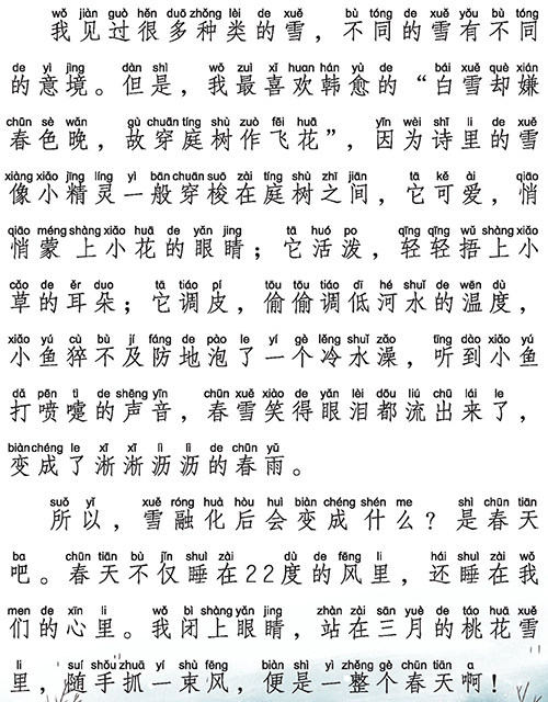 语言小精灵 小作者说春雪像小精灵,我说她本人就是语言小精灵吧,用如此优美诗意的语言来描写这场可爱活泼的春雪。春雪变成春雨的想象,既新奇又充满童趣。结尾句的仿写,应和开篇引用的诗句“白雪却嫌春色晚,故穿庭树作飞花”,让春雪这一古韵悠远的意象更加富有自由灵动的感觉。(东 东)