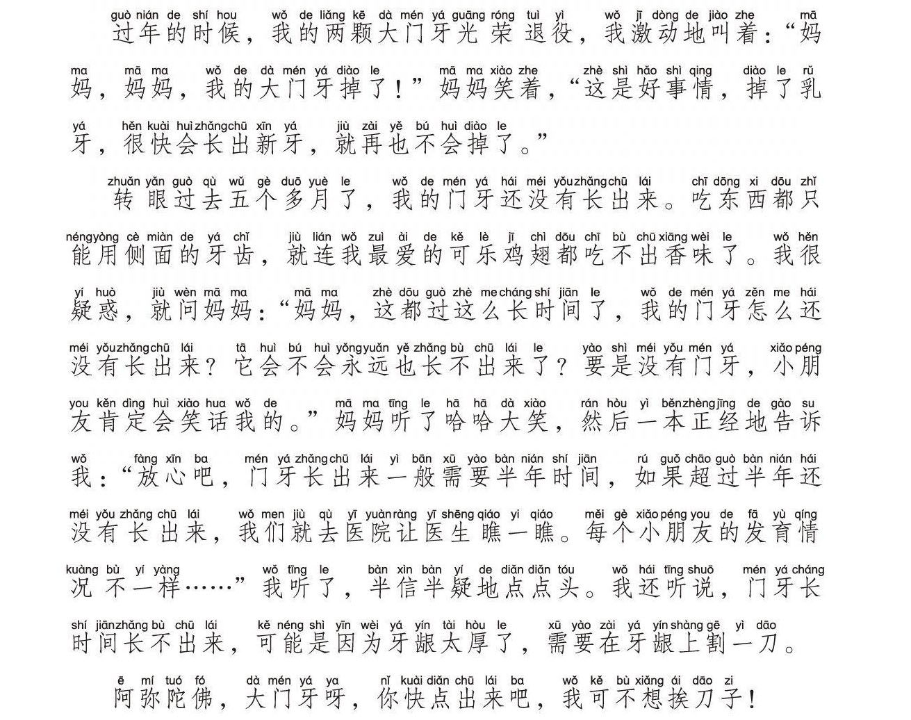 过年的时候,我的两颗大门牙光荣退役,我激动地叫着:“妈妈,妈妈,我的大门牙掉了!”妈妈笑着,“这是好事情,掉了乳牙,很快会长出新牙,就再也不会掉了。” 转眼过去五个多月了,我的门牙还没有长出来。吃东西都只能用侧面的牙齿,就连我最爱的可乐鸡翅都吃不出香味了。我很疑惑,就问妈妈:“妈妈,这都过这么长时间了,我的门牙怎么还没有长出来?它会不会永远也长不出来了?要是没有门牙,小朋友肯定会笑话我的。”妈妈