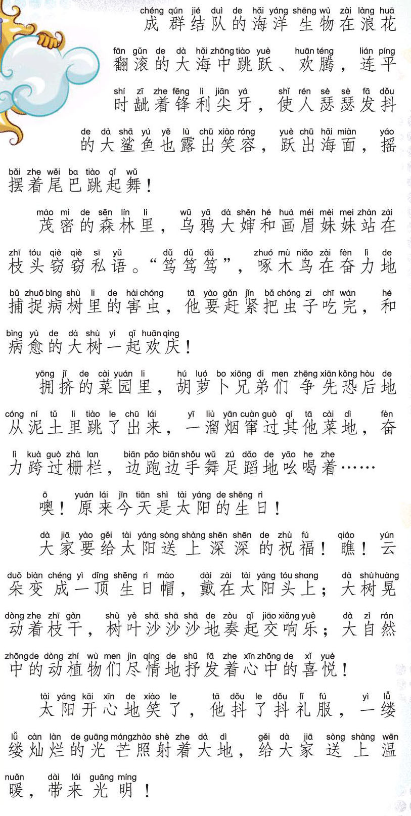 成群结队的海洋生物在浪花翻滚的大海中跳跃、欢腾,连平时龇着锋利尖牙,使人瑟瑟发抖的大鲨鱼也露出笑容,,跃出出海面,摇摆着尾巴跳起舞! 茂密的森林里,乌鸦大婶和画眉妹妹站在枝头窃窃私语。“笃笃笃”,啄木鸟在奋力地捕捉病树里的害虫,他要赶紧把虫子吃完,和病愈的大树一起欢庆! 拥挤的菜园里,胡萝卜兄弟们争先恐后地从泥土里跳了出来,一溜烟窜过其他菜地,奋力跨过栅栏,边跑边手舞足蹈地吆喝着…… 噢!原