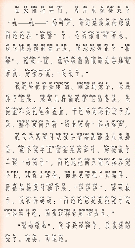 回家刚打开门,客厅里就传来了“叽——叽——”的叫声,肯定是我家的豚鼠肉坨坨在“报警”了,它好像非常 着急。我飞快地跑到笼子边,肉坨坨停止了“报警”,缩成一团,黑珍珠般的眼睛期盼地望着我,好像在说:“我饿了。” 我赶紧把食盒装满。刚放进笼子,它就扑了上来,差点儿打翻我手上的食盒。它把整个头扎进食盒里,下巴的肉都抖动了起来,整个房间只有“呱唧呱唧”的咀嚼声。 我又把莴笋叶从笼子顶端的缝隙里塞进去,