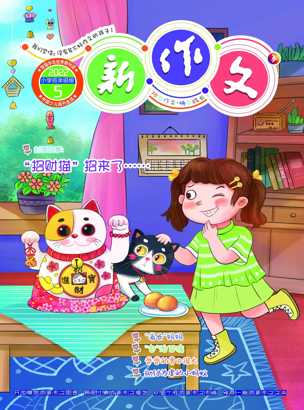 我家客厅的橱窗里,摆放着一只呆萌可爱的招财猫。 这只招财猫看上去惟妙惟肖,栩(xǔ)栩如生。初见,我像捡到宝一样,迫不及待地跑了过去。细瞧,它有一对镶(xiāng)了金边的红耳朵,像两弯红月牙。一双圆溜溜的大眼睛,好似夜空中明亮的星星。还有一张一合的嘴,嘻嘻,你天生就会谈生意吧。它整个身子胖乎乎的,披着金黄色的外套,圆圆的肚皮上还刻着“招财进宝”四个大字。有趣的是,它胸前戴着一个金色的铃铛,总发