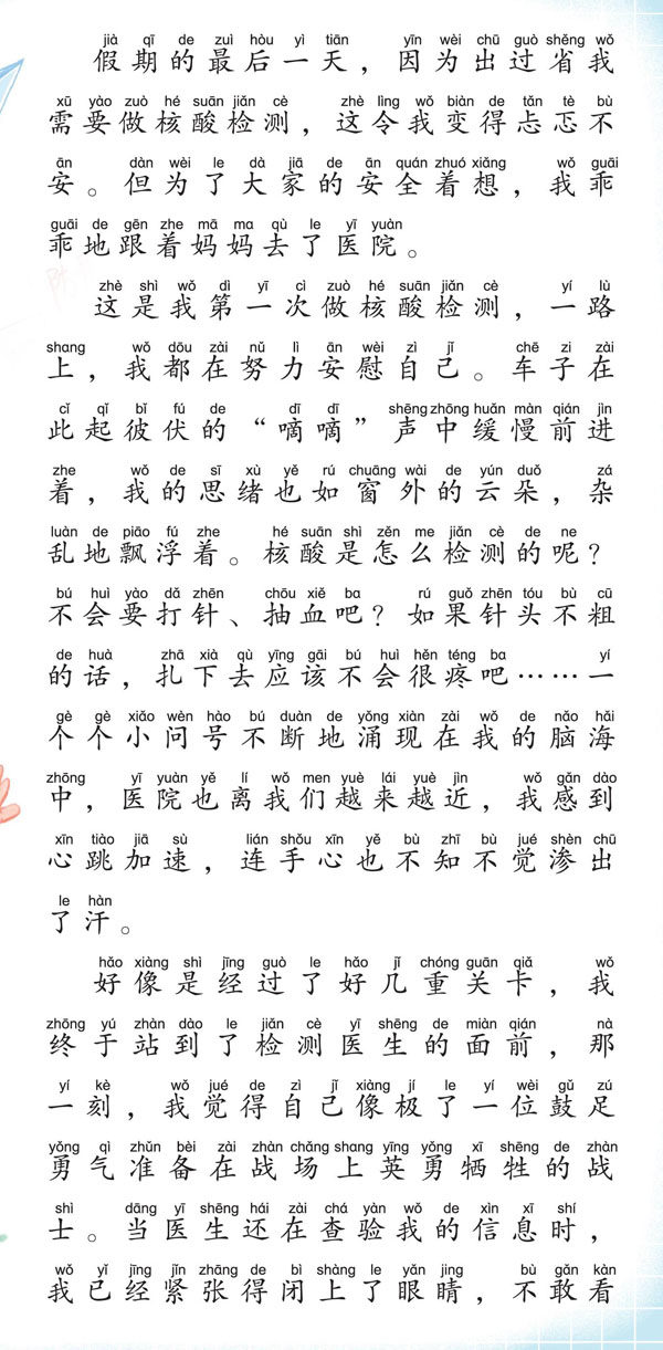 假期的最后一天,因为出过省我需要做核酸检测,这令我变得忐忑不安。但为了大家的安全着想,我乖乖地跟着妈妈去了医院。 这是我第一次做核酸检测,一路上,我都在努力安慰自己。车子在此起彼伏的“嘀嘀”声中缓慢前进着,我的思绪也如窗外的云朵,杂乱地飘浮着。核酸是怎么检测的呢?不会要打针、抽血吧?如果针头不粗的话,扎下去应该不会很疼吧……一个个小问号不断地涌现在我的脑海中,医院也离我们越来越近,我感到心跳加速