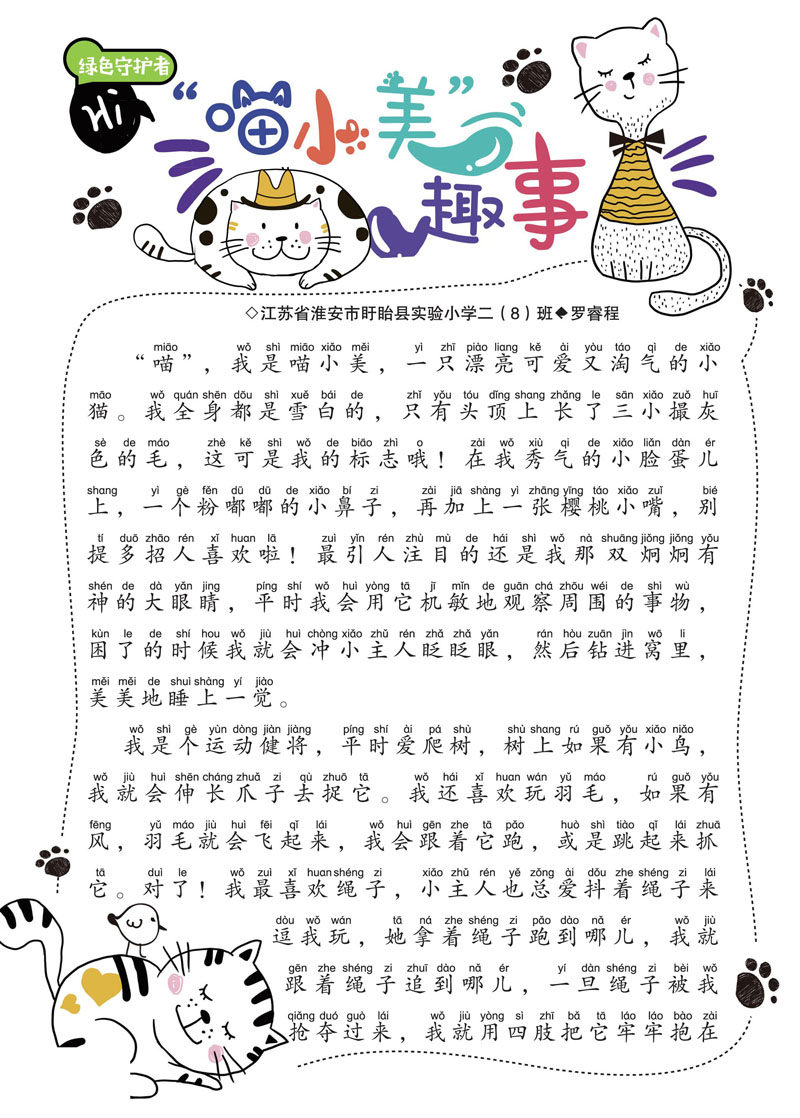 “喵”,我是喵小美,一只漂亮可爱又淘气的小猫。我全身都是雪白的,只有头顶上 长了三小撮灰色的毛,这可是我的标志哦!在我秀气的小脸蛋儿上,一个粉嘟嘟的小鼻子,再加上一张樱桃小嘴,别提多招人喜欢啦!最引人注目的还是我那双炯炯有神的大眼睛,平时我会用它机敏地观察周围的事物,困了的时候我就会冲小主人眨眨眼,然后钻进窝里,美美地睡上一觉。 我是个运动健将,平时爱爬树,树上如果有小鸟,我就会伸长爪子去捉它。