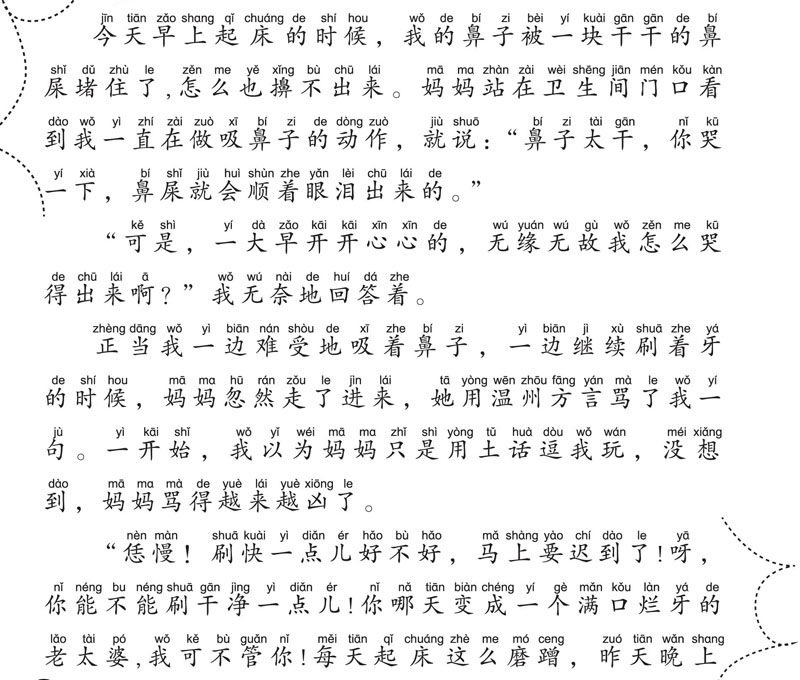 今天早上起床的时候,我的鼻子被一块干干的鼻屎堵住了,怎么也擤不出来。妈妈站在卫生间门口看到我一直在做吸鼻子的动作,就说:“鼻子太干,你哭一下,鼻屎就会顺着眼泪出来的。” “可是,一大早开开心心的,无缘无故我怎么哭得出来啊?”我无奈地回答着。 正当我一边难受地吸着鼻子,一边继续刷着牙的时候,妈妈忽然走了进来,她用温州方言骂了我一句。一开始,我以为妈妈只是用土话逗我玩,没想到,妈妈骂得越来越凶了。