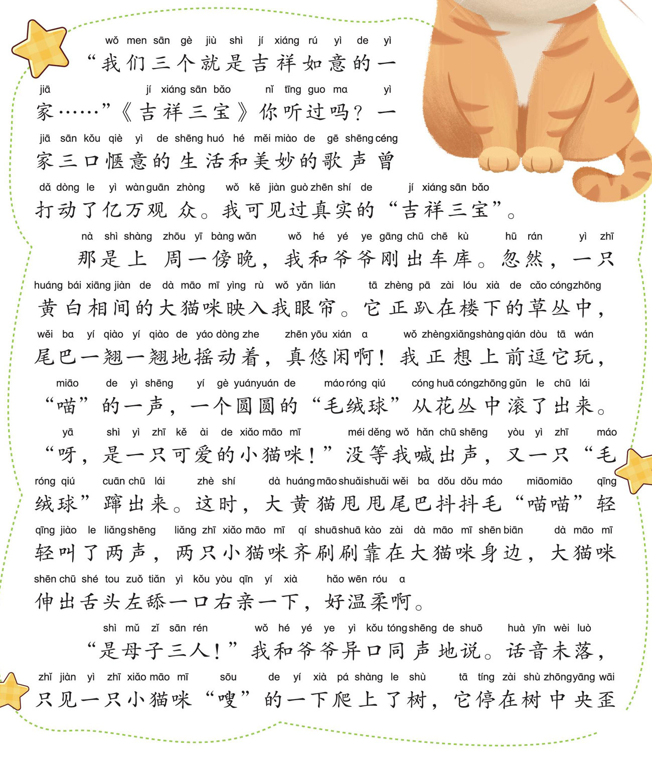 “我们三个就是吉祥如意的一家……”《吉祥三宝》你听过吗?一家三口惬意的生活和美妙的歌声曾打动了亿万观 众。我可见过真实的“吉祥三宝”。 那是上 周一傍晚,我和爷爷刚出车库。忽然,一只黄白相间的大猫咪映入我眼帘。它正趴在楼下的草丛中,尾巴一翘一翘地摇动着,真悠闲啊!我正想上前逗它玩,“喵”的一声,一个圆圆的“毛绒球”从花丛中滚了出来。“呀,是一只可爱的小猫咪!”没等我喊出声,又一只“毛绒球”蹿出来