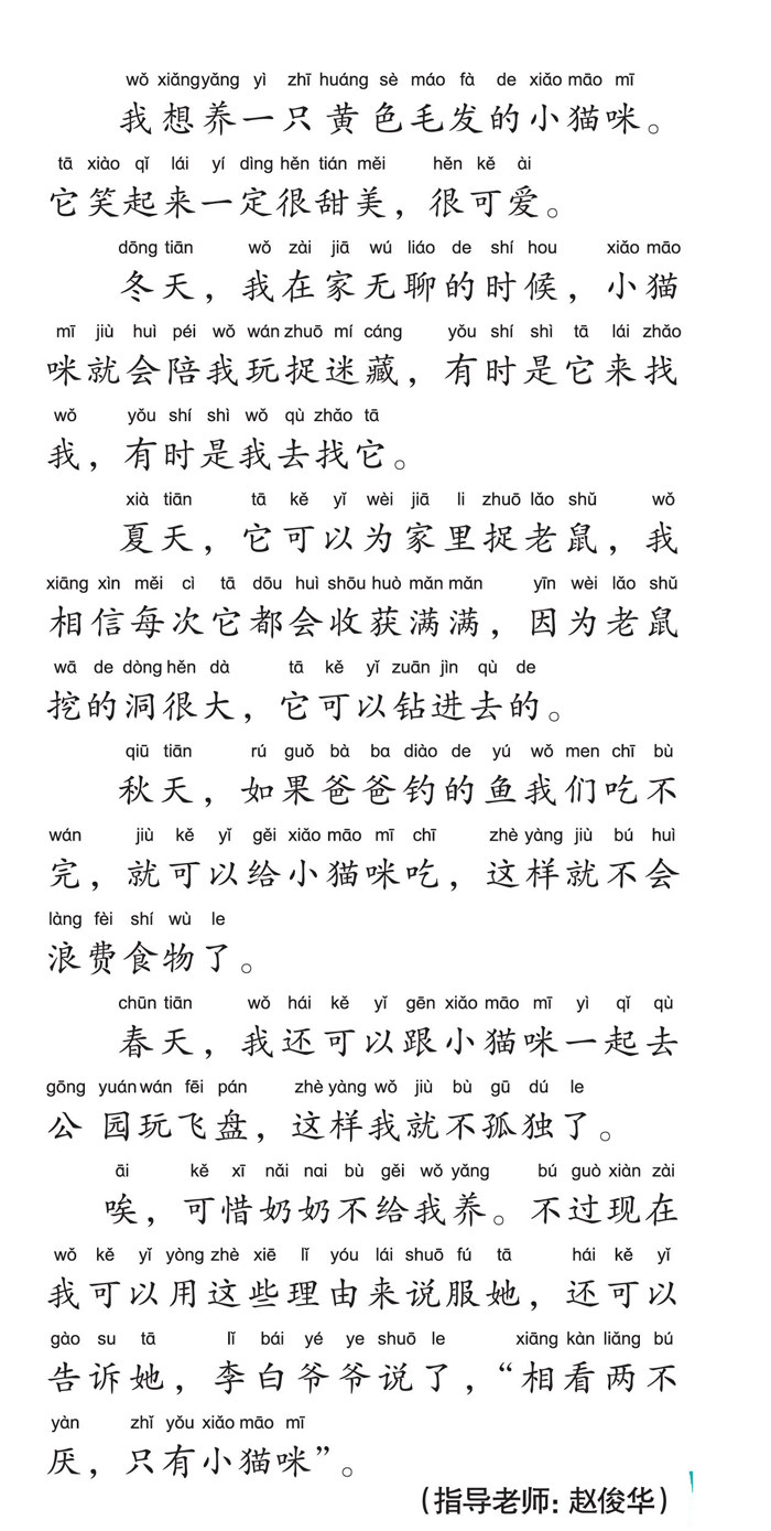 我想养一只黄色毛发的小猫咪。它笑起来一定很甜美,很可爱。 冬天,我在家无聊的时候,小猫咪就会陪我玩捉迷藏,有时是它来找我,有时是我去找它。 夏天,它可以为家里捉老鼠,我相信每次它都会收获满满,因为老鼠挖的洞很大,它可以钻进去的。 秋天,如果爸爸钓的鱼我们吃不完,就可以给小猫咪吃,这样就不会浪费食物了。 春天,我还可以跟小猫咪一起去公 园玩飞盘,这样我就不孤独了。 唉,可惜奶奶不给我养。不