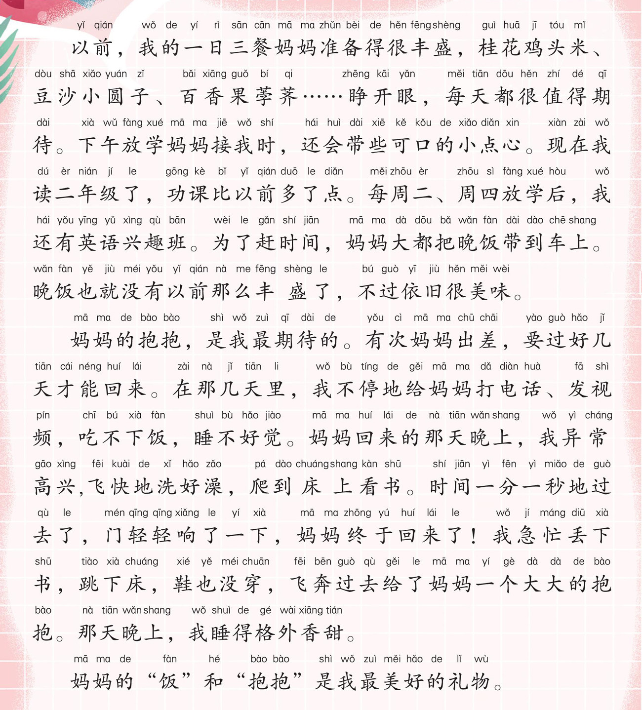 以前,我的一日三餐妈妈准备得很丰盛,桂花鸡头米、豆沙小圆子、百香果荸荠……睁开眼,每天都很值得期待。下午放学妈妈接我时,还会带些可口的小点心。现在我读二年级了,功课比以前多了点。每周二、周四放学后,我还有英语兴趣班。为了赶时间,妈妈大都把晚饭带到车上。晚饭也就没有以前那么丰 盛了,不过依旧很美味。 妈妈的抱抱,是我最期待的。有次妈妈出差,要过好几天才能回来。在那几天里,我不停地给妈妈打电话、发视