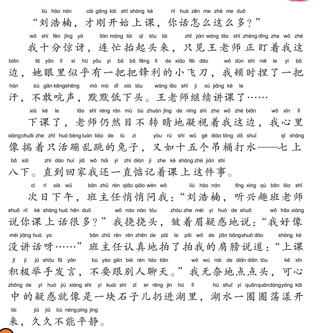 “刘浩楠,才刚开始上课,你话怎么这么多?” 我十分惊讶,连忙抬起头来,只见王老师正盯着我这边,她眼里似乎有一把把锋利的小飞刀,我顿时捏了一把汗,不敢吭声,默默低下头。王老师继续讲课了…… 下课了,老师仍然目不转睛地凝视着我这边,我心里像揣着只活蹦乱跳的兔子,又如十五个吊桶打水——七上八下。直到回家我还一直惦记着课上这件事。 次日下午,班主任悄悄问我:“刘浩楠,听兴趣班老师说你课上话很多?”我