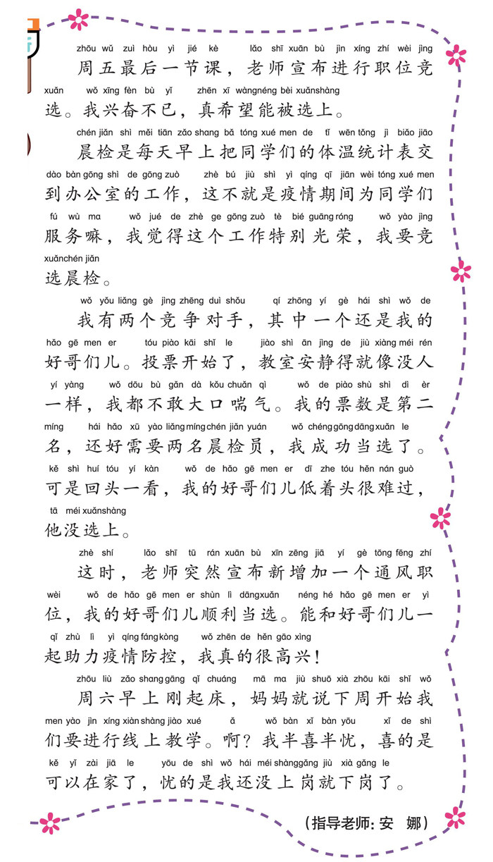 周五最后一节课,老师宣布进行职位竞选。我兴奋不已,真希望能被选上。 晨检是每天早上把同学们的体温统计表交到办公室的工作,这不就是疫情期间为同学们服务嘛,我觉得这个工作特别光荣,我要竞选晨检。 我有两个竞争对手,其中一个还是我的好哥们儿。投票开始了,教室安静得就像没人一样,我都不敢大口喘气。我的票数是第二名,还好需要两名晨检员,我成功当选了。可是回头一看,我的好哥们儿低着头很难过,他没选上。