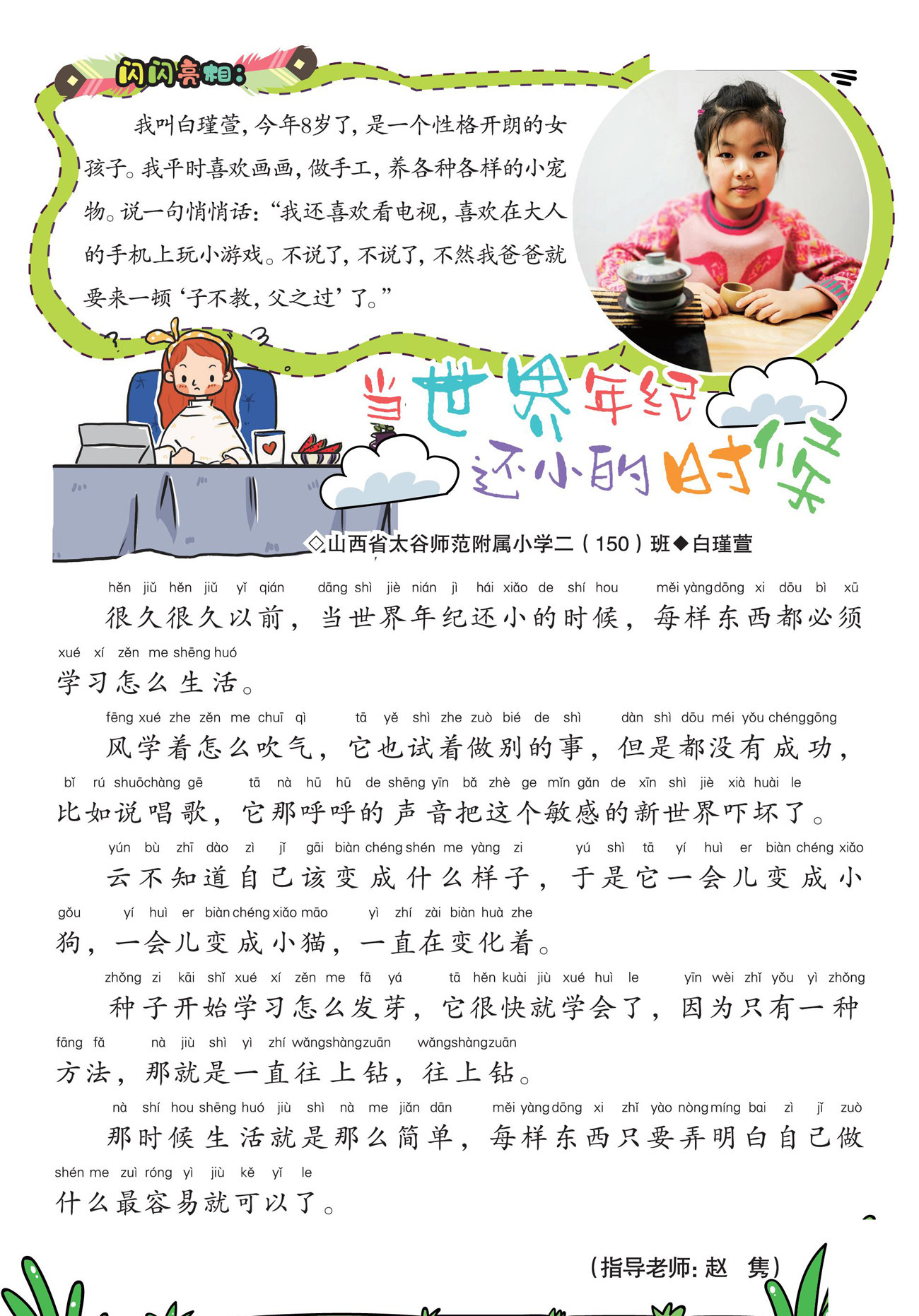 闪闪亮相: 我叫白瑾萱,今年8岁了,是一个性格开朗的女孩子。我平时喜欢画画,做手工,养各种各样的小宠物。说一句悄悄话:“我还喜欢看电视,喜欢在大人的手机上玩小游戏。不说了,不说了,不然我爸爸就要来一顿‘子不教,父之过’了。” 很久很久以前,当世界年纪还小的时候,每样东西都必须学习怎么生活。 风学着怎么吹气,它也试着做别的事,但是都没有成功,比如说唱歌,它那呼呼的声音把这个敏感的新世界吓坏了。