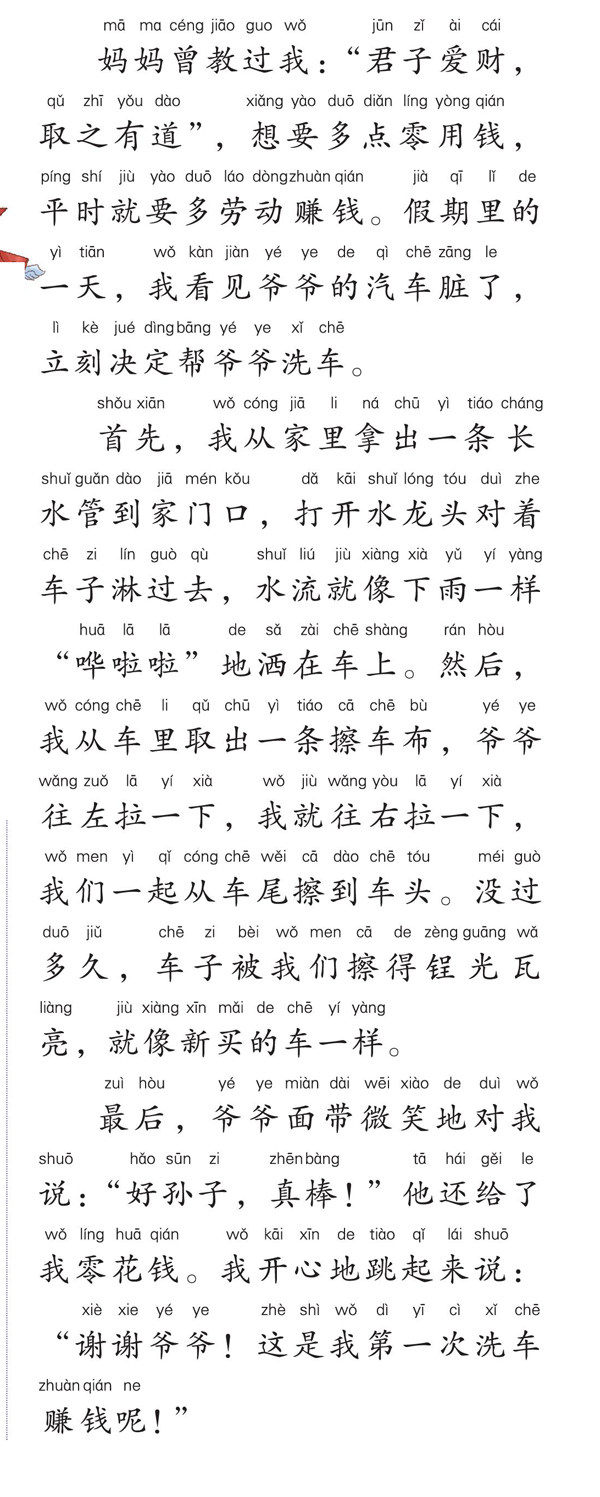妈妈曾教过我:“君子爱财,取之有道”,想要多点零用钱,平时就要多劳动赚钱。假期里的一天,我看见爷爷的汽车脏了,立刻决定帮爷爷洗车。 首先,我从家里拿出一条长水管到家门口,打开水龙头对着车子淋过去,水流就像下雨一样“哗啦啦”地洒在车上。然后,我从车里取出一条擦车布,爷爷往左拉一下,我就往右拉一下,我们一起从车尾擦到车头。没过多久,车子被我们擦得锃光瓦亮,就像新买的车一样。 最后,爷爷面带微笑地对