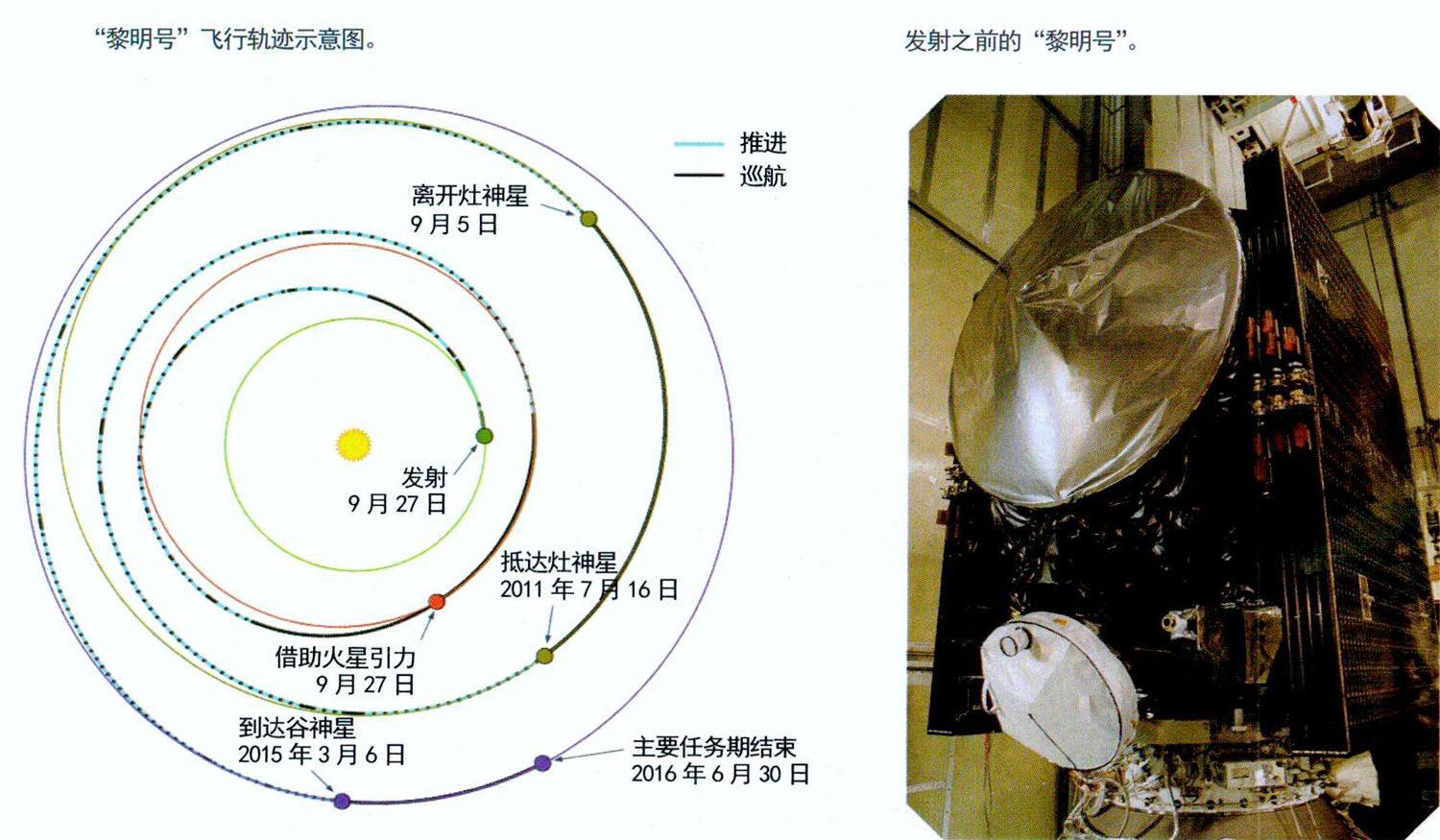 2007年9月27日升空的“黎明号”,是第一艘一趟造访两颗星——灶神星和谷神星的航天器。2011年5月3日,“黎明号”在距离灶神星120万千米处对准灶神星拍摄了第一幅图像。在环绕灶神星13个月后,“黎明号”采用离子发动机转向,朝着谷神星飞去。2015年3月6日,“黎明号”在距离谷神星6.1万千米处被谷神星的引力捕捉。 不过,“黎明号”在就快要到达谷神星时遭遇宇宙射线袭击,不得不放弃直接靠近谷神星