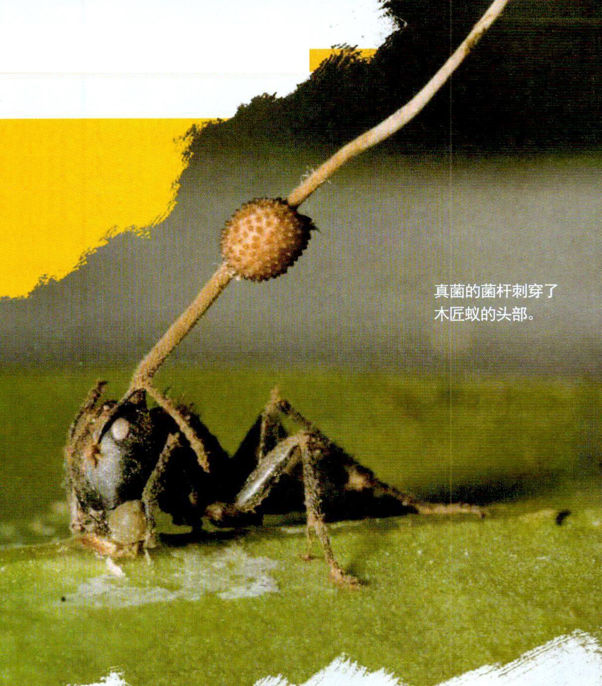 真菌寄生,蚂蚁变“僵尸” 在巴西的热带丛林,如果你能找到离地面刚好25厘米的一片叶子,你就可能会在叶子背面发现一只外出觅食的木匠蚁——它的下颚紧紧锁住叶片中央最粗的那根脉络,但它早已死去,而凶手是可怕的偏侧蛇虫草菌——一种能操控宿主的寄生真菌。 偏侧蛇虫草菌通过寄生蚂蚁完成繁殖。 木匠蚁一般生活在树冠上层,平时只有觅食的工蚁会外出。当它们在林地上爬行时,身体可能会沾上偏侧蛇虫草菌的孢子。