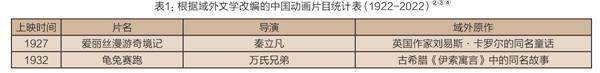 一、中国动画域外文学改编的缘起与发展 在中国动画的百年发展历史中,域外文学始终是中国动画题材的重要来源之一。从20世纪二三十年代到新中国成立前是中国动画域外文学改编的萌芽期。秦立凡制作了根据英国作家刘易斯·卡罗尔同名儿童文学作品改编的《爱丽丝漫游奇境记》[1]、万氏兄弟制作了取材于古希腊文学经典《伊索寓言》的《龟兔赛跑》《蝗虫与蚂蚁》《飞来祸》《骆驼献舞》等动画[2]。这些动画作品是中国动画与域