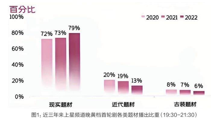 近年来现实题材越来越“火热”,根据CSM媒介研究发布的数据,2022年现实题材在上星频道晚黄档首轮剧占比79%[1](如图1所示)。这一年,国产电视剧一如既往地以一种“坚守现实”的创作姿态照亮现实。以《人世间》为代表的电视剧,直面苦难,以温暖现实主义的气质获得观众青睐。“CSM数据显示《人世间》1-58集总观众规模已达3.71亿人。CSM35中心城市数据显示《人世间》单集最高收视率达3.38%,收