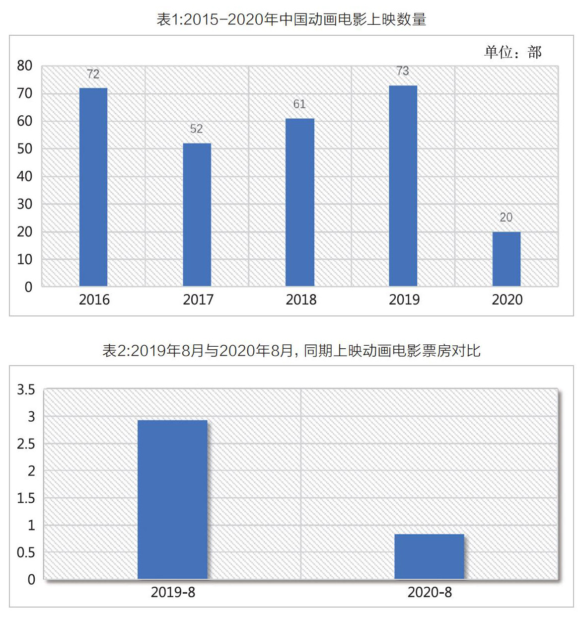 一、数据解读:2020-2021年春节档期中国动画电影先抑后扬 (一)2020年中国动画电影市场整体降温 1.规模缩减,作品上映数量与总票房均回落 2020年,历经178天的院线空窗期,全年动画电影共上映20部,纵观2016-2020年全国动画电影上映数量(表1),与2019年的73部相较,减少了72.6%,与2018年的61部相较减少了67.2%。[1]2020年中国动画电影上映数量在延续