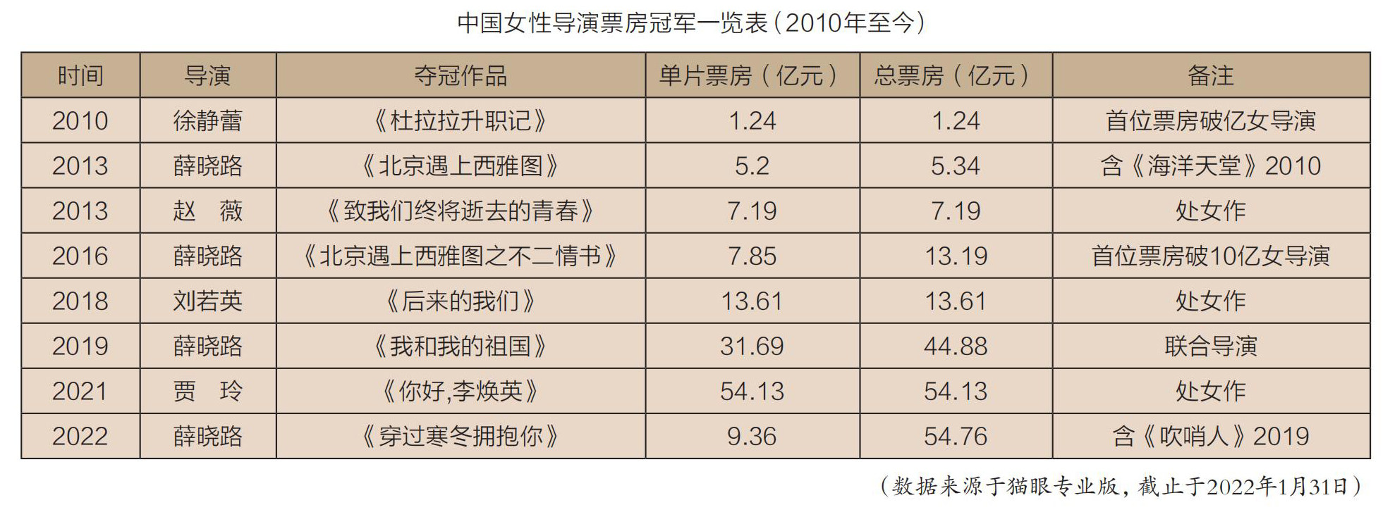 近十年来,国内女性导演在商业电影领域的表现亮眼,票房成绩屡创新高。目前,国内最具票房号召力的女性导演可能依然是薛晓路导演。自2013年的《北京遇上西雅图》开始,薛晓路便时常占据着中国女性导演的票房冠军,即便不断有新人导演的处女作刷新单片票房纪录,她也依然能够凭借持续创作,稳如常青树。最近的案例,便是在贾玲《你好,李焕英》的票房奇迹之后,薛晓路凭借2022年年初的《穿过寒冬拥抱你》,再度重回总票房第