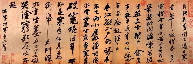 黄州寒食帖 北宋 苏轼 苏轼善画竹石,尤其擅长墨竹,师出文同(文与可,苏轼表兄),并称“文苏”,是“湖州竹派”的重要代表人物。苏轼传世至今的画作极少,只有二幅:《潇湘竹石图》和《木石图》。似乎这两幅画也还存疑。没有疑问的是苏轼明确提出了“士人画”这个概念,以此便被牢牢载入了中国绘画的史册。因为“士人画”的概念提出为以后出现的“文人画”和“写意画”的发展奠定了理论基础。所以,苏轼对绘画的主要贡