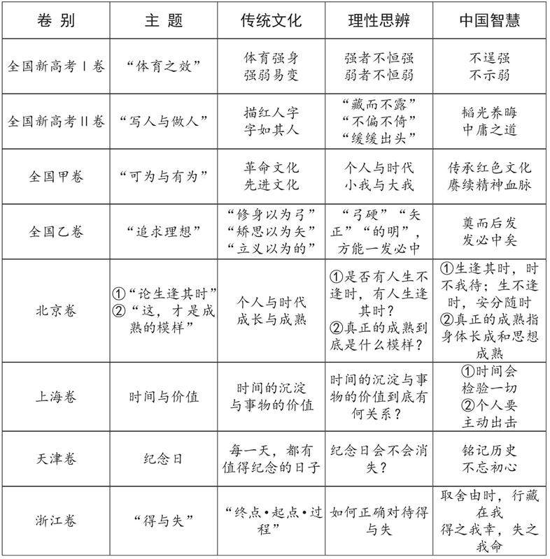 2021年全国高考语文共八套试卷九道作文题目(北京卷作文为二选一),可谓百花齐放,蔚为壮观。各题目均追求超强的价值引导性,又各有千秋。如全国甲卷细数红色节日、歌曲、英雄榜样,以饱含激情的笔触引导考生思考“可为与有为”,北京卷罗列出不同人在同一时代中的不同态度,但要求考生“论生逢其时”,可谓开门见山大气磅礴;又如全国乙卷以射箭为喻谈理想追求,新高考Ⅰ卷以“体育之效”论强弱转换,新高考Ⅱ卷以描红为喻谈